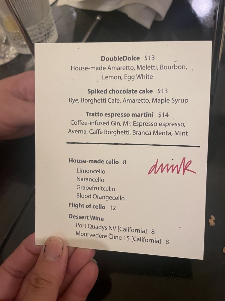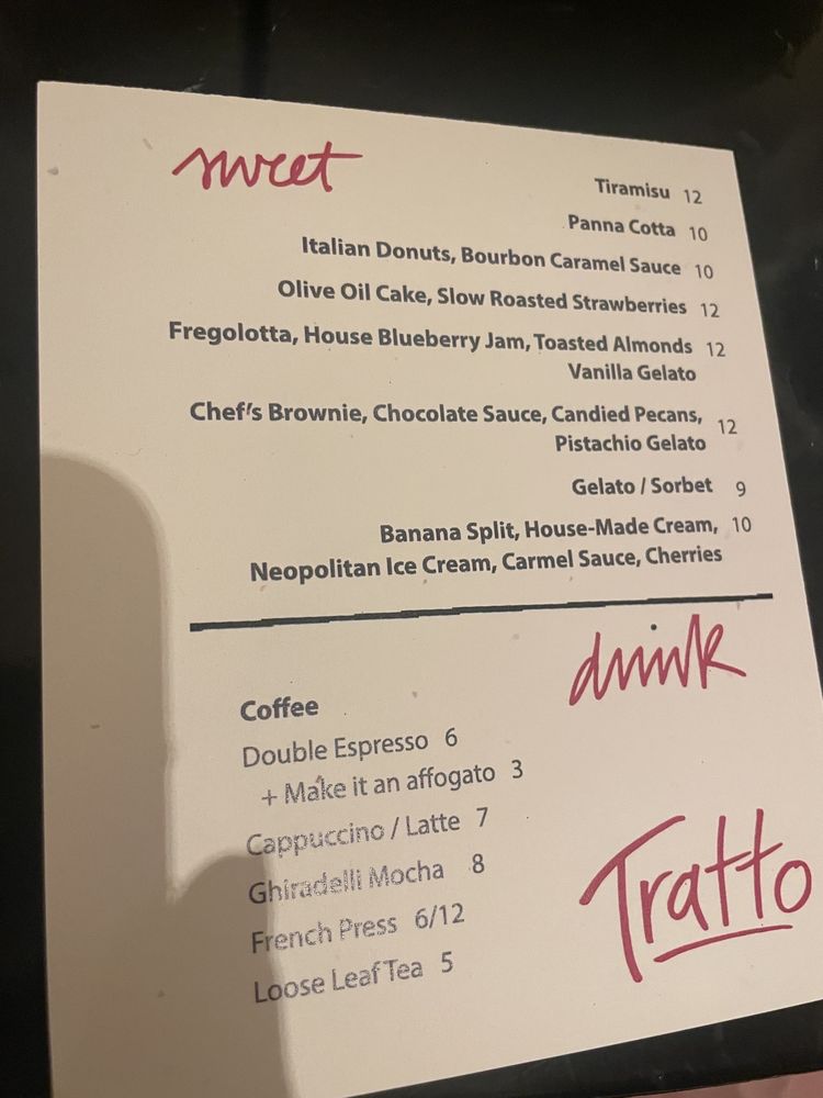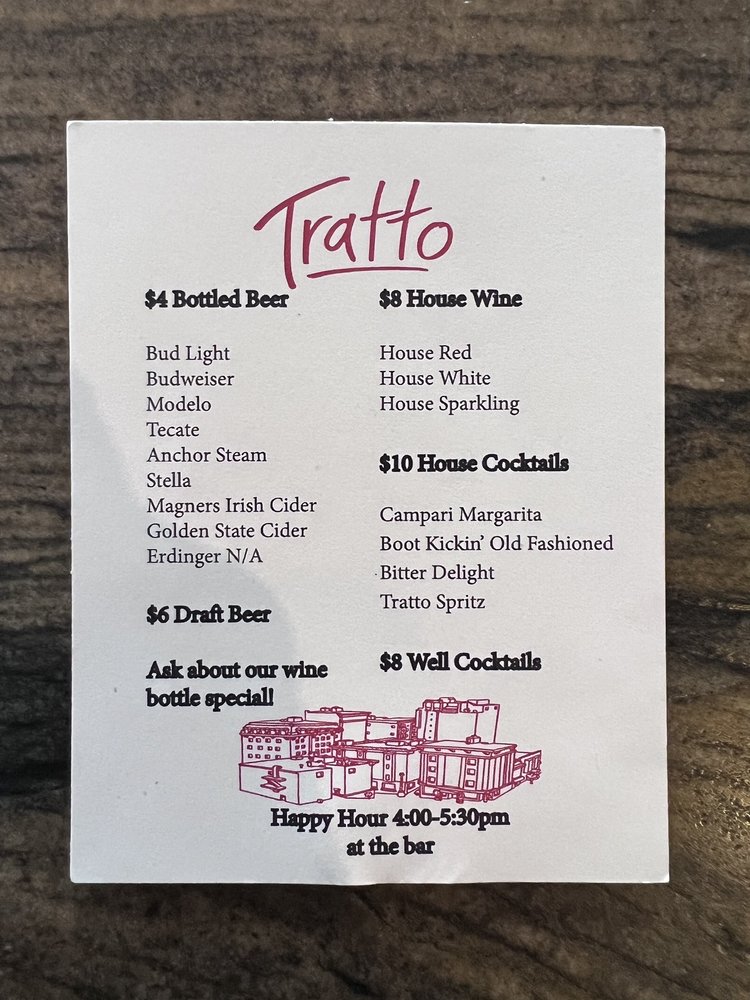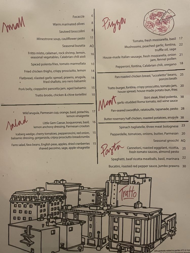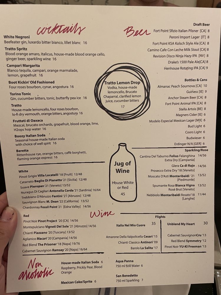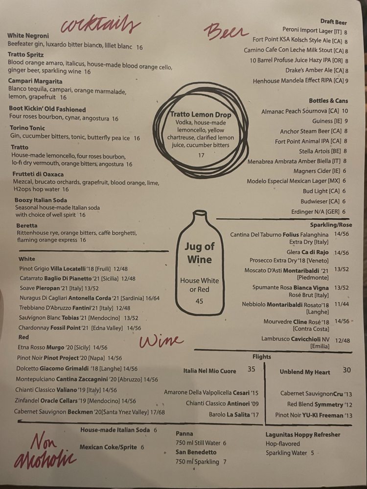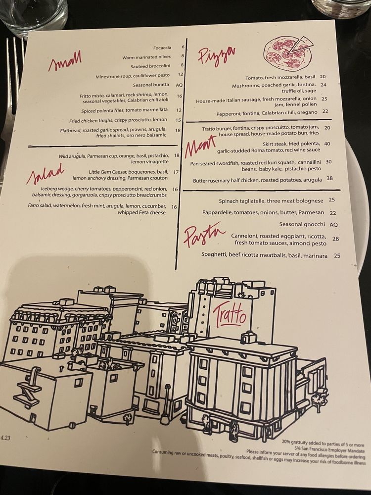 "Tratto, located in San Francisco, offers a unique dining experience with its trendy and classy ambiance. The menu features a variety of options, including vegan choices, and the restaurant is wheelchair accessible. Customers have praised the Fritto Misto, a delectable deep-fried mix of calamari, seasonal vegetables, and even battered lemon. The spaghetti and meatballs have also received high praise for their flavor. The restaurant's service is fast and respectful, making it a great spot for brunch, lunch, or dinner. With a full bar, happy hour specials, and a relaxed atmosphere, Tratto is perfect for a night out with friends or a date night. Whether you're craving pizza, pasta, or a delicious dessert like the best Tiramisu, Tratto is a must-visit dining destination in San Francisco."